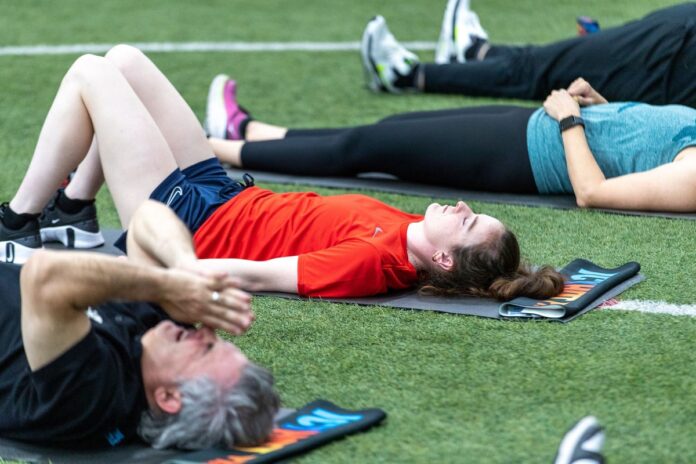 People meditate on a soccer field in May 2023 in Tukwila, Washington. Experts say mental and physical health challenges can provide similar health benefits to Dry January (Getty Images for Icy Hot)